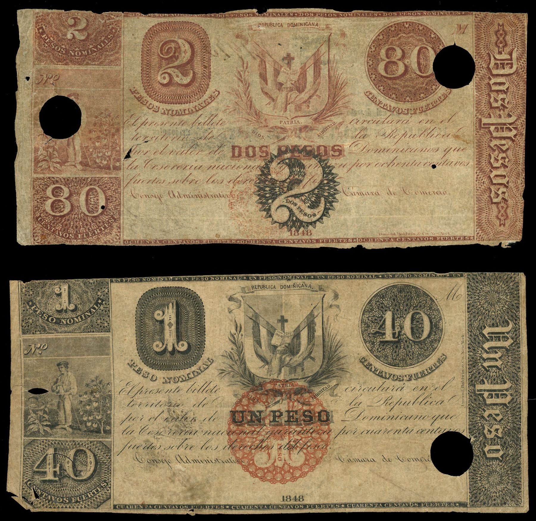 Lot of two Dominican Republic, Spanish Administration notes of 1848: 2 peso = 80 centavos and 1 peso = 40 centavos. SCWPM-6, 7. Both Very Good with some splits and punch hole cancellations, desirable as early Dominican notes.