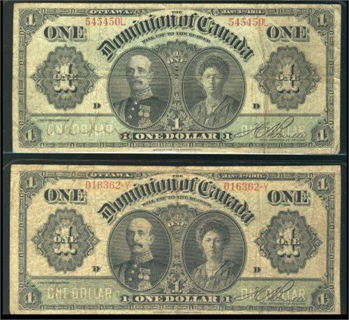 Lot of two Dominion banknotes including a DC-18d and a DC-18di. Both are dated 1911 with black lines. VG+ to Fine.