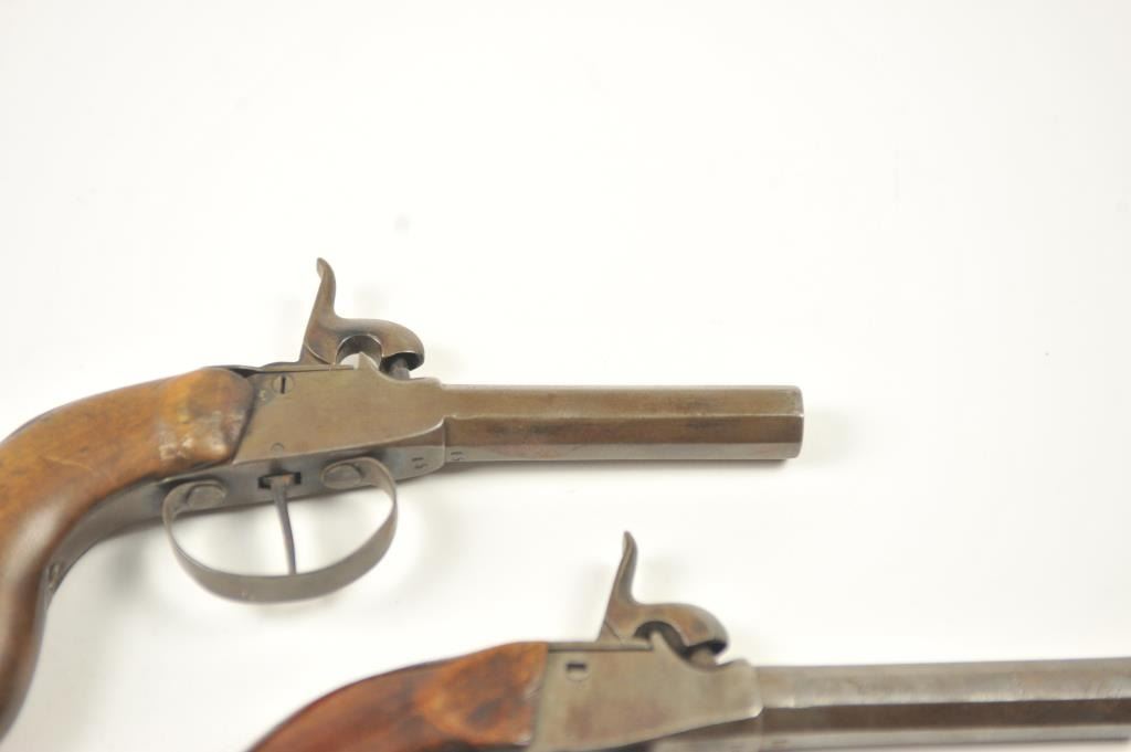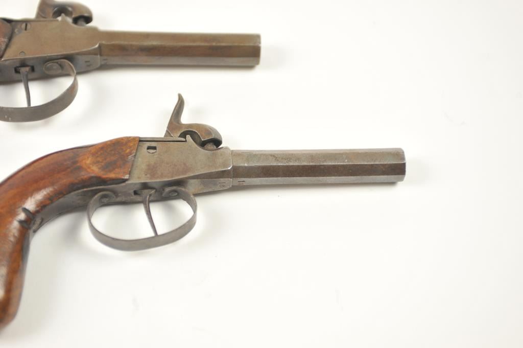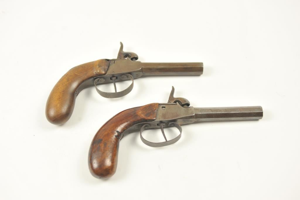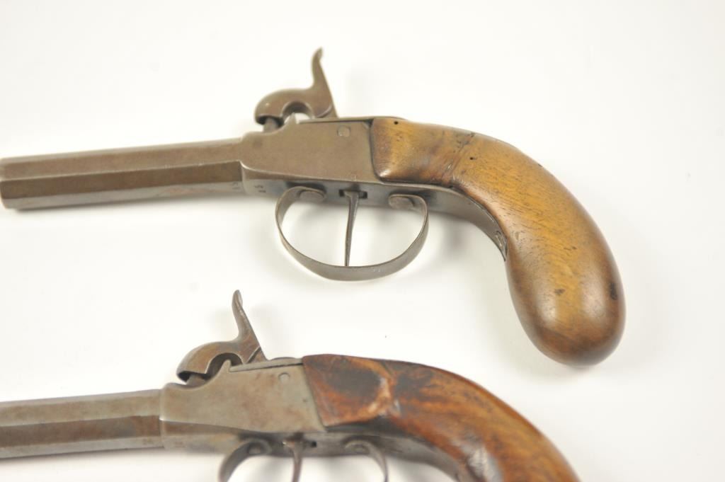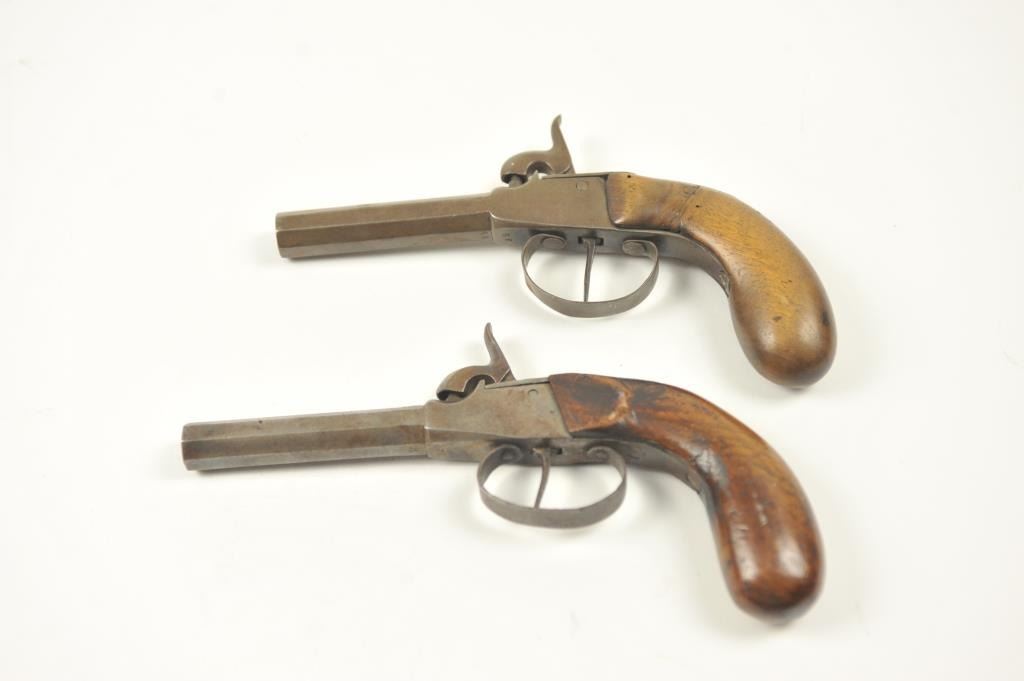 Lot of two European percussion pistols made for export circa 1840-1860’s, no proofs, Central European in origin in good to very good condition. 7 ½” in overall length with octagon barrels of .45-.50 caliber. Manywere imported during the Civil War era. Est.: $150-$300. (Antique).