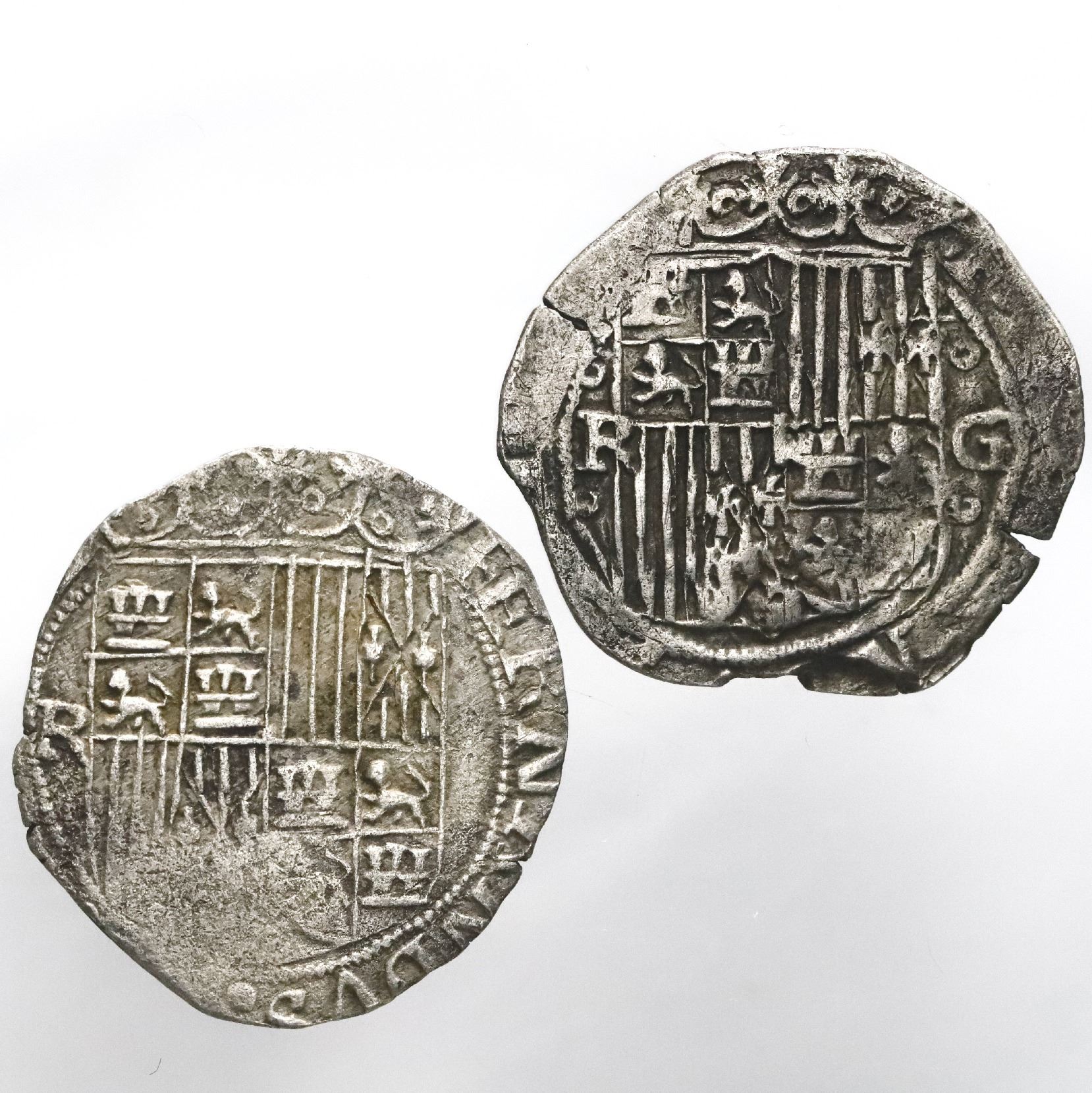 Lot of two Granada, Spain, 1R, Ferdinand-Isabel, assayer R. 6.17 grams total. Both VF with some bold detail and light surface corrosion, one with a few small edge cracks.
