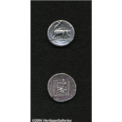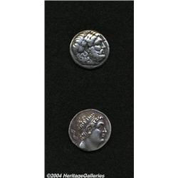 <B>Lot of two Hellenistic tetradrachms.</B></I> Includes: Seleukid Kingdom. Seleukos I. Elephant quadriga. Fine // Graeco-Baktrian Kingdom. Euthydemos I. Good VF/VF, fields smoothed. 2 coins <BR><BR><B>Important notice:</B> Heritage usually auctions material at the rate of 200-250 lots per hour. On some occasions eBay Live bid software or the Internet may not be able to keep up with the pace of the auction. We recommend placing a realistic absentee bid now as insurance to avoid disappointment. Occasionally the auctioneer may eliminate or reject an eBay Live bid, and the auctioneer may also reopen a lot after the close of the eBay live bidding (usually because we missed an audience bid), and may reject your bid even if it shows you as the winning bidder. By bidding via eBay Live, you agree that Heritage may award the lot to another bidder at its sole discretion under the circumstances described above or any other reasonable circumstances. Since eBay bids are not shown to us until we open the lot on the floor, we treat those bids just like floor bids. In most cases the floor responds before the eBay bid is presented to us, due to Internet lag time, so for consistency we have made it a policy that floor bids are always considered first over tie eBay live bids. Also please note that all Heritage lots purchased through eBay Live carry a 20% Buyer's Premium. Please make sure you read the Terms and Conditions before you bid.