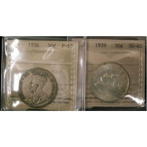 Lot of two ICCS 50¢, 1936 F-15 and 1939 MS-60.