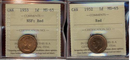 Lot of two ICCS MS65 Red 1¢. Includes 1952 & 1953 NSF.
