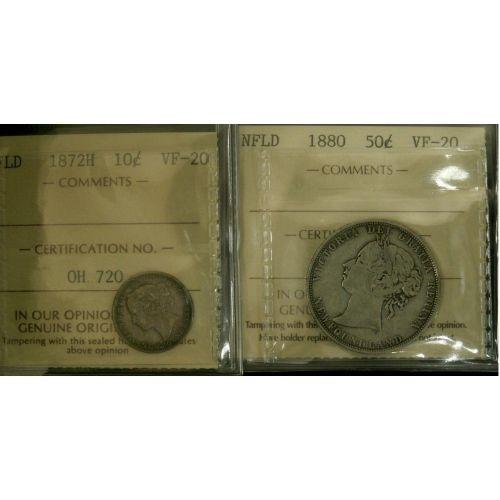 Lot of two ICCS NFLD coins, 1872H 10¢ VF-20 AND 1880 50¢ VF-20