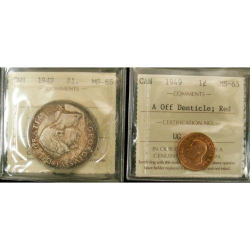 Lot of two ICCS graded coins, 1949 1 cent A off dent ICCS MS65 red, 1949 $1 MS-65 nicely toned.