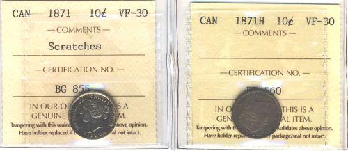 Lot of two ICCS graded coins. Includes an 1871H VF30 toned and an 1871 VF30 with some very faint scratches.