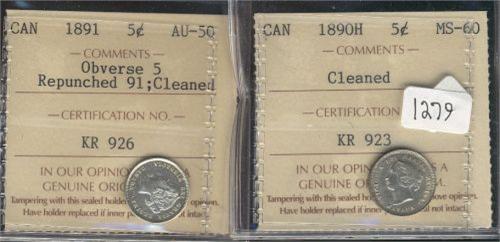 Lot of two ICCS graded coins. Includes a 1890H MS60 and a 1891 Obv. 5 Repunched 91 AU50. Both coins are brilliant and lightly cleaned.