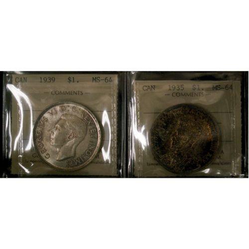 Lot of two ICCS silver dollars, 1935 and 1939 both MS-64 and nicely toned
