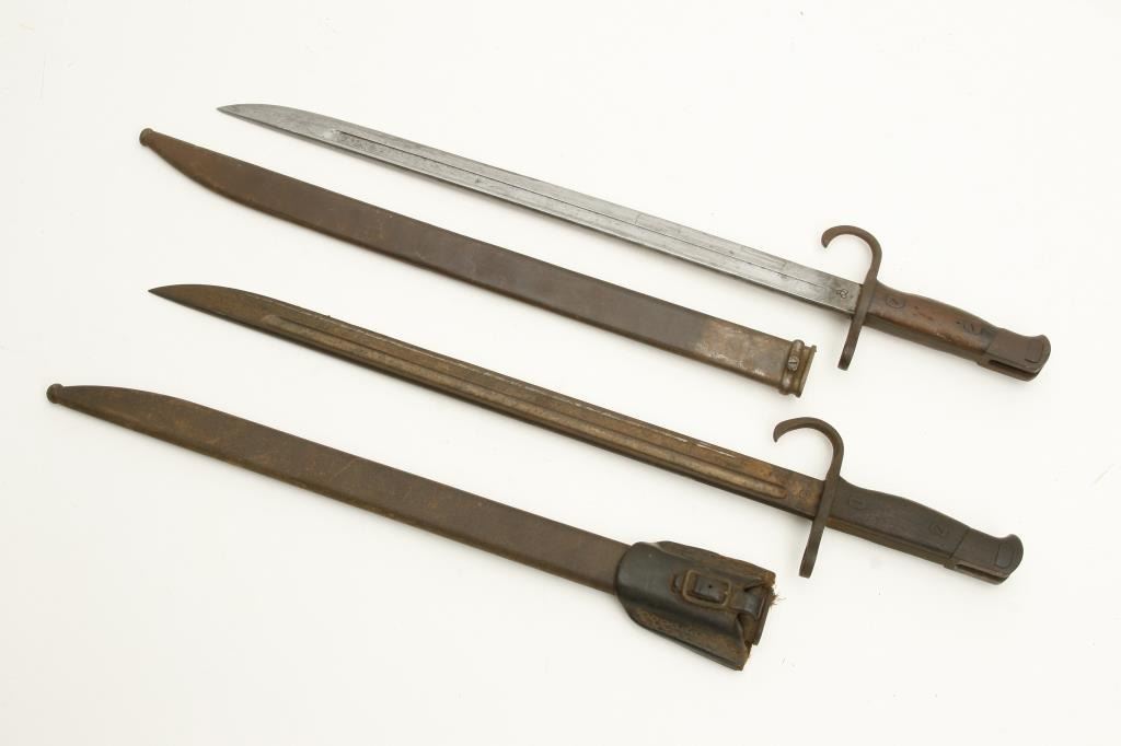 is 20” in overall length with a 15 ½” blade. The first shows even toning of the blade with a proof at the finger guard and a wood handle showing wear and a dark patina. The bayonet includes a metal scabbard with moderate surface rust and the remains of a leather frog. The second bayonet is similar in composition with a different proof at the guard and metal scabbard with surface rust. Neither of the bayonets appears to have been sharpened. Est.: $100-$200
