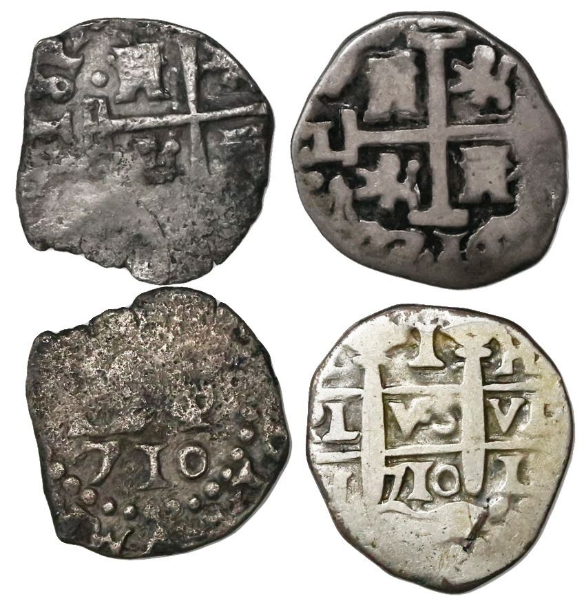 Lot of two Lima, Peru, cob minors of 1710, assayer H (one 1R and one 1/2R). 3.80 grams total. Same-size coins due to trimming on the 1R, which bears a choice full cross-lions-castles and pillars, contrastingly toned VG, the 1/2R XF with full but off-center cross and bold date but light surface corrosion as reportedly from the 1715 Fleet.