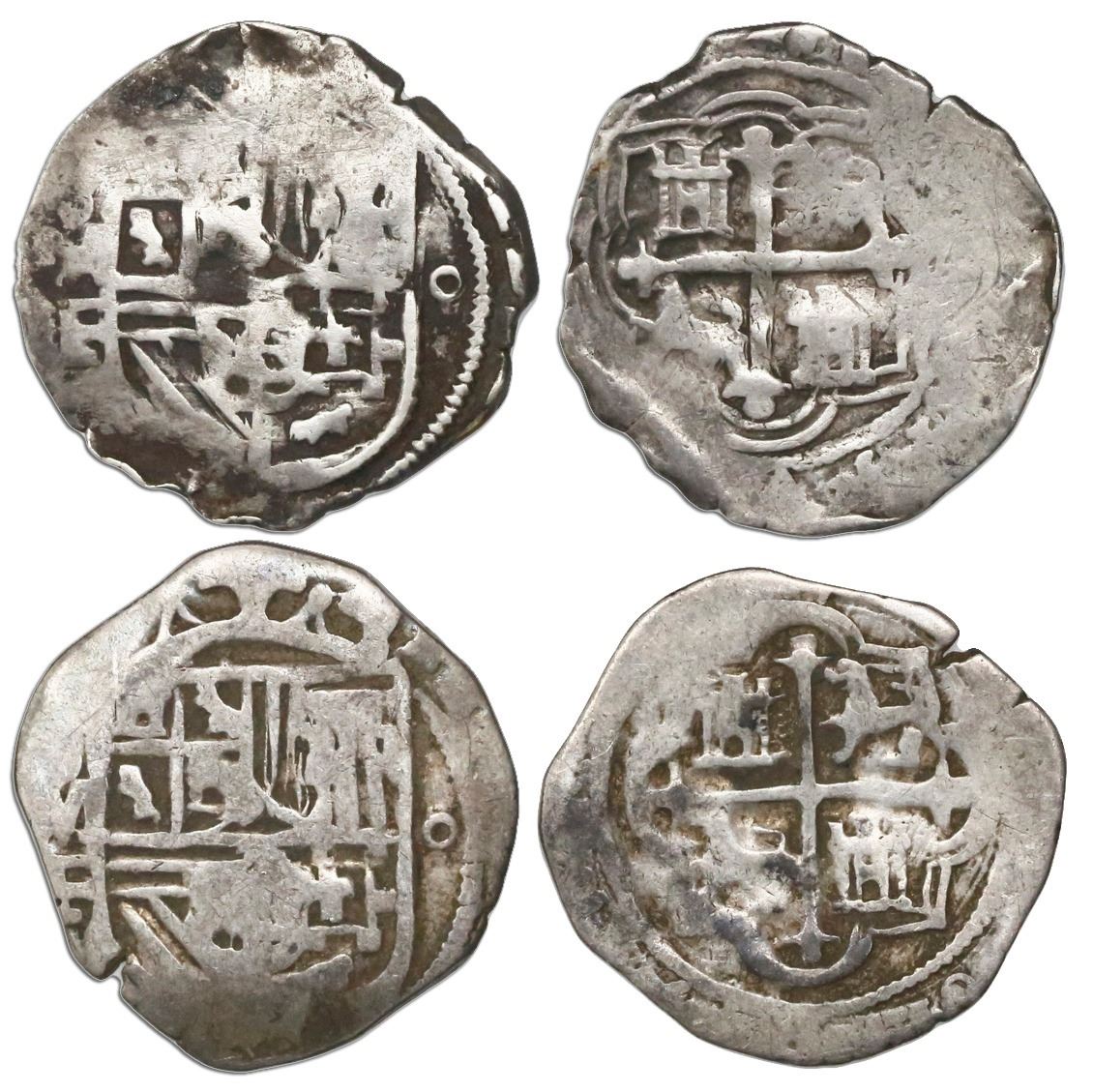 Lot of two Mexico City, Mexico, cob 1R, Philip II or III, assayer F to left, second assayer o to right, extremely rare. 6.54 grams total. First of its kind we have seen: two specimens from apparently identical dies but both well worn, kept together to further establish legitimacy of this unique issue that seems to prove the existence of assayer o in this period (probably related to the very rare contemporaneous assayers "oF" and "F-oD"). Both Fine+ with toned fields.