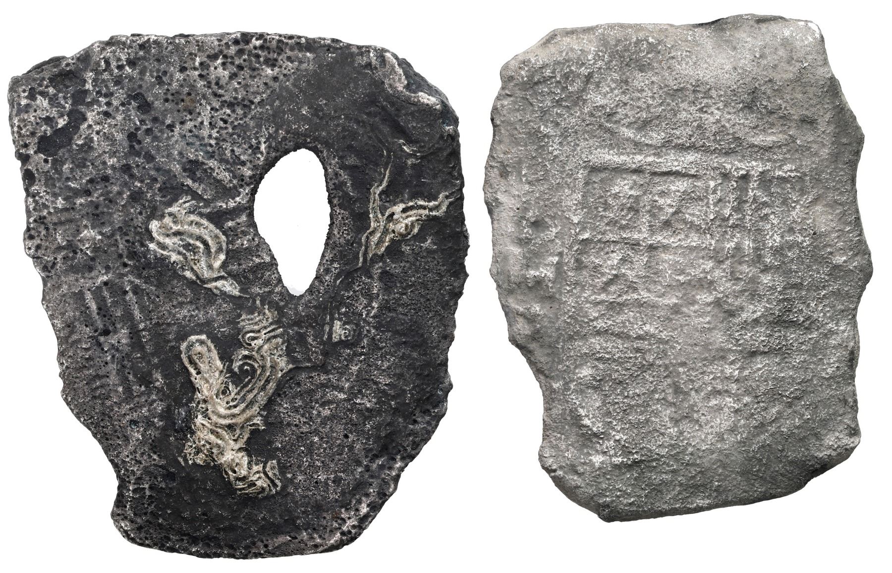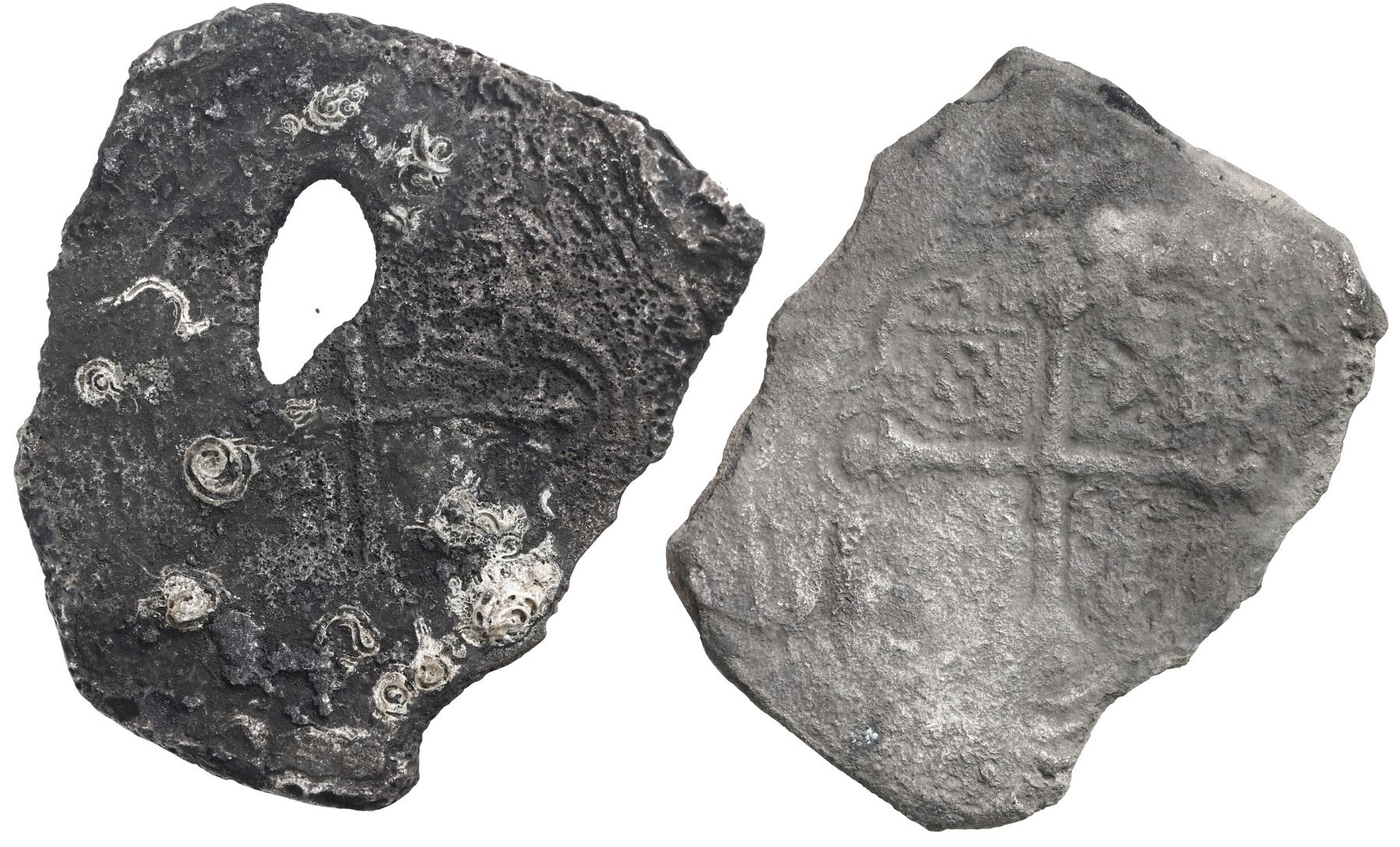 Lot of two Mexico City, Mexico, cob 8 reales, Philip IV, assayers not visible. KM-45. 33.30 grams total. Both dark and corroded, one with interesting natural bubble-hole in center and wormy traces of encrustation plus a partial date (16)5(?). Recovered from: Maravillas, sunk in 1656 off Grand Bahama Island.