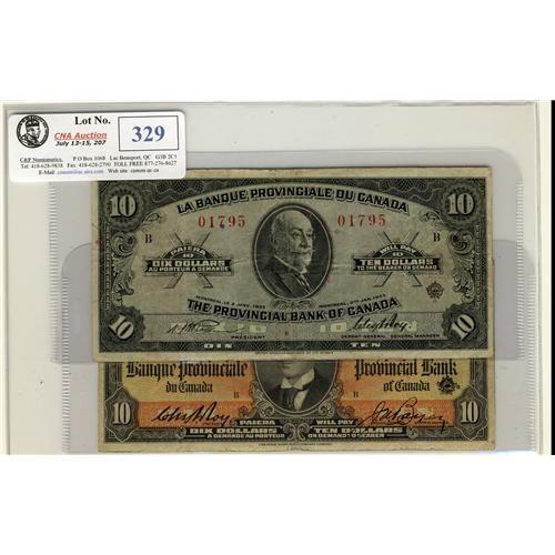 Lot of two, Provincial Bank $10 notes F/VF. CH-615-18-06 1936 $10 and CH-615-16-04 1935 $10.