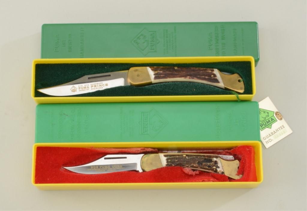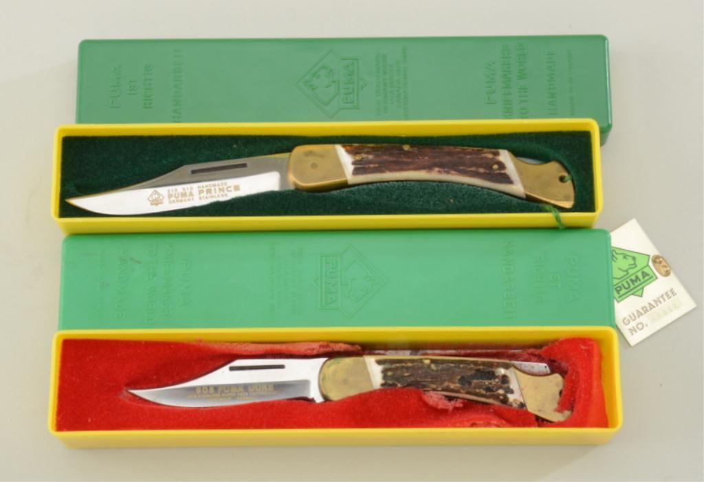 Lot of two Puma brand hand-made folding  knives in factory plastic cases with stag  grips and both in overall fine condition; one  is the “Duke” model; the other is the  “Prince” model; interior of the “Duke” casing has partially deteriorated; these knives  retailed for over $100 each.  Est.:   $50-$100.