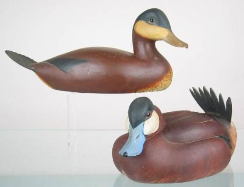 Lot of two Ruddy ducks by noted Cape Cod decoy carver and fine instrument craftsman Donald MacKenzie. A turned head drake with glass eyes, fan tail and wing outlines. "D. MacKenzie" carved into the bottom. XOP. A sleepy turned head drake with glass eyes and fancy tail and wing carving. "Miller" impressed into the bottom. Both in XOP.