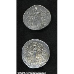 Lot of two Seleukid tetradrachms. Includes: Antiochos VII. Antioch. SMA 277. Nice VF, well centered // Antiochos VIII. Damascus. LSM 99. VF.From the Morris Geiger Collection. 2 coins Important notice: Heritage usually auctions material at the rate of 200-250 lots per hour. On some occasions eBay Live bid software or the Internet may not be able to keep up with the pace of the auction. We recommend placing a realistic absentee bid now as insurance to avoid disappointment. Occasionally the auctioneer may eliminate or reject an eBay Live bid, and the auctioneer may also reopen a lot after the close of the eBay live bidding (usually because we missed an audience bid), and may reject your bid even if it shows you as the winning bidder. By bidding via eBay Live, you agree that Heritage may award the lot to another bidder at its sole discretion under the circumstances described above or any other reasonable circumstances. Also please note that all Heritage lots purchased through eBay Live carry a 20% Buyer's Premium. Please make sure you read the Terms and Conditions before you bid.