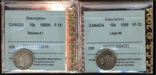 Lot of two Ten cents, both CCCS graded, 1880 F15 and 1899 VF30.