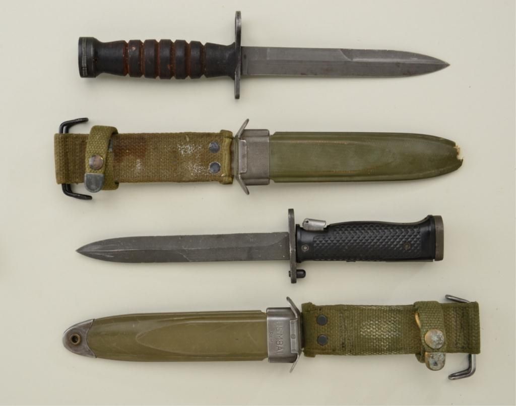 Lot of two U.S. bayonets, on with leather stack grip and in a U.S.M8 sheath missing tip guard; one with a checkered black plastic grip and in a U.S.M8A1. Est.: $100-$200.