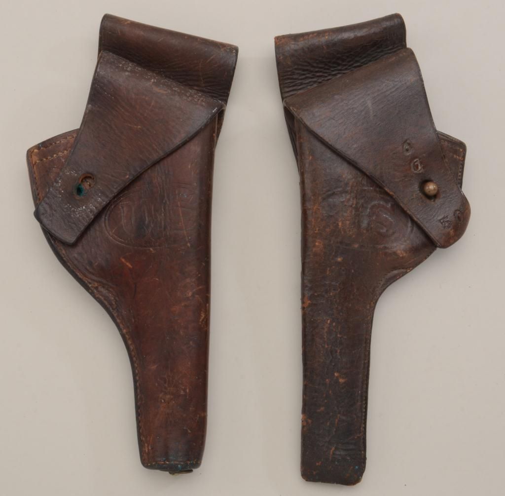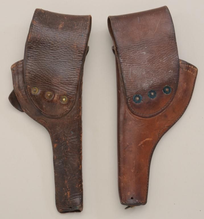 Lot of two U.S. military leather flap holsters for DA revolvers, one in overall fair to good condition with brass ring in muzzle plug, three rivet belt loop; the other with thinner barrel area of holster, inoverall fair condition with cracking and flaking to leather, flap marked “6Co” and “50”. Est.: $50-$100.