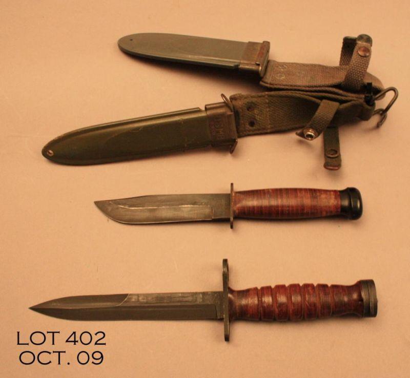 Lot of two WW-II knives, one M-1 Carbine bayonet and one Camillus utility knife in scabbards, both in very nice condition. Est. $100-$200.