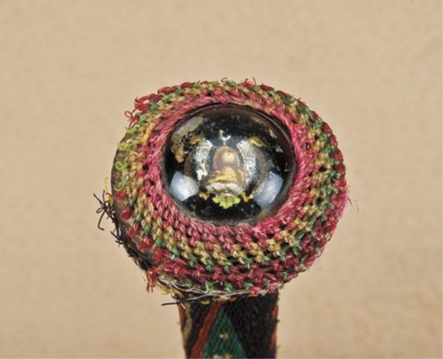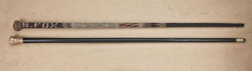 Lot of two antique walking stick; 1) Gold filled ornate head that is nicely inscribed “Presented to C. R. Kaplinger by his grand army friends, February 17, 1903”. The stick measures 35-5/8” in length, including head. Head approx. 2”. The top of the head shows dents. The black and hardwood shaft is good. Probably a presentation between veterans to an admired officer or colleague. 2) Unusual walking stick with braided horse hair overlay, 36-1/4” from tip to tip. Shows multicolor died horsehair with flags and geometrics and the name S. Fox. The condition is good to very good. We would date it about 1900 – 1920. Est: $350 - $700