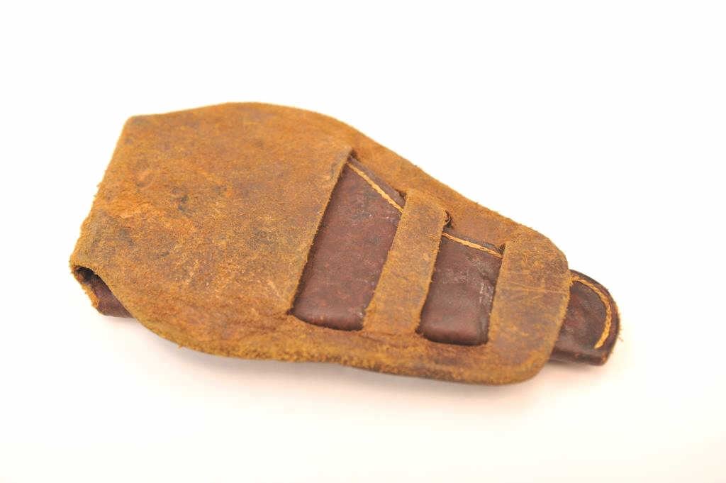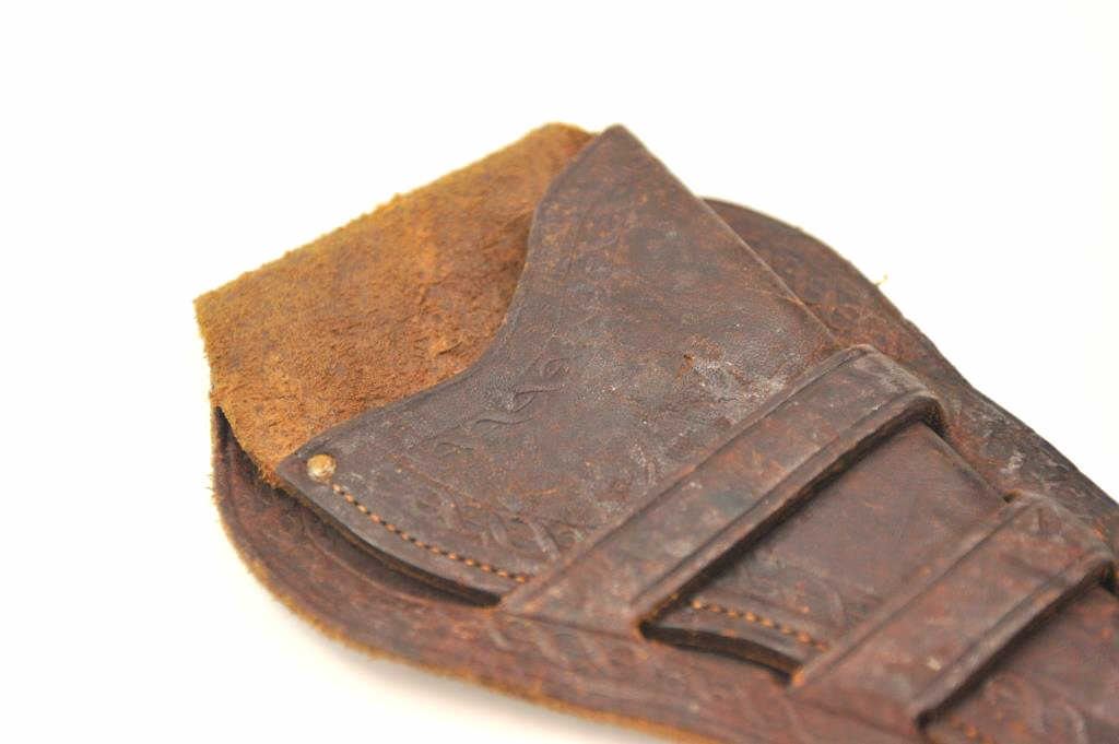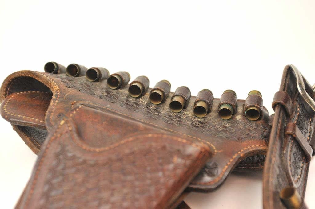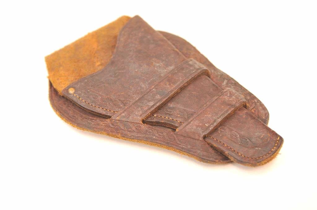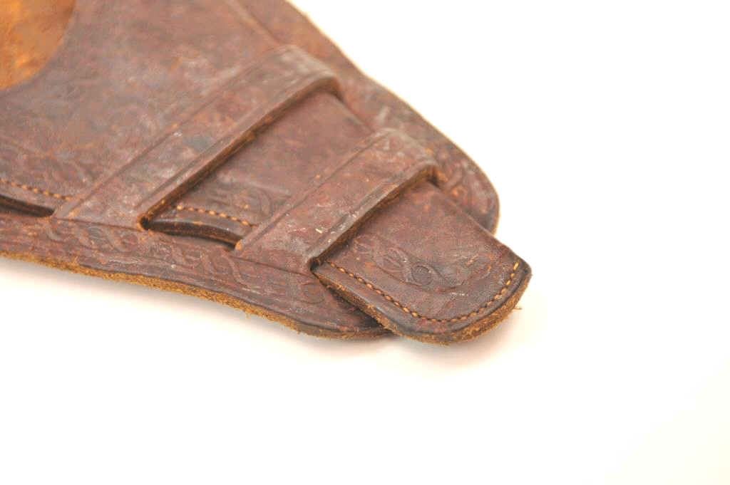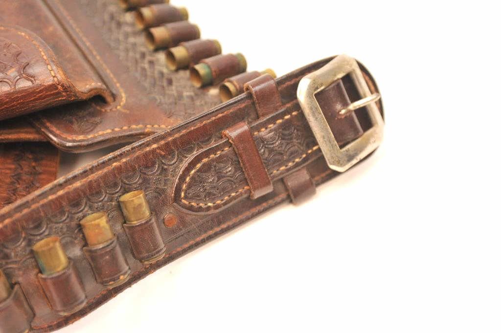 Lot of two authentic western holsters, one with cartridge belt. 1. Single loop basket weave and tooled leather holster with a matching belt, .45 Colt caliber cartridge loops, built toaccommodate a 5 ½” barrel. The holster shows early H. H. Heiser of Denver marks on the skirt, dating to the 1900-1920’s. The belt measures 34”-36” and is in good overall condition.2. Leather double loop holster for a 4 ½” barrel revolver (unmarked), measuring approximately 4” across the top, possibly for a Colt Lightning, in good overall condition dating to the 1880-1910’s era. Est.:$100-200.