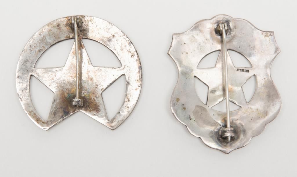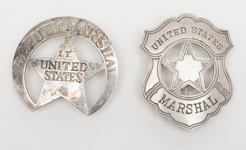 Lot of two badges including a U.S. Marshal shield type badge marked “Sterling” on reverse and a Deputy Marshal I.T. United States “Half Moon” badge with no maker marks on the reverse. Est.: $200-$400