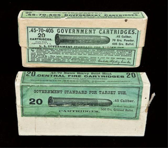 Lot of two boxes of .45-70 cartridges by Winchester, both full, opened, good condition, some tatters on the edges, good to very good labels that are 90-95% intact. Est: $250 - $500
