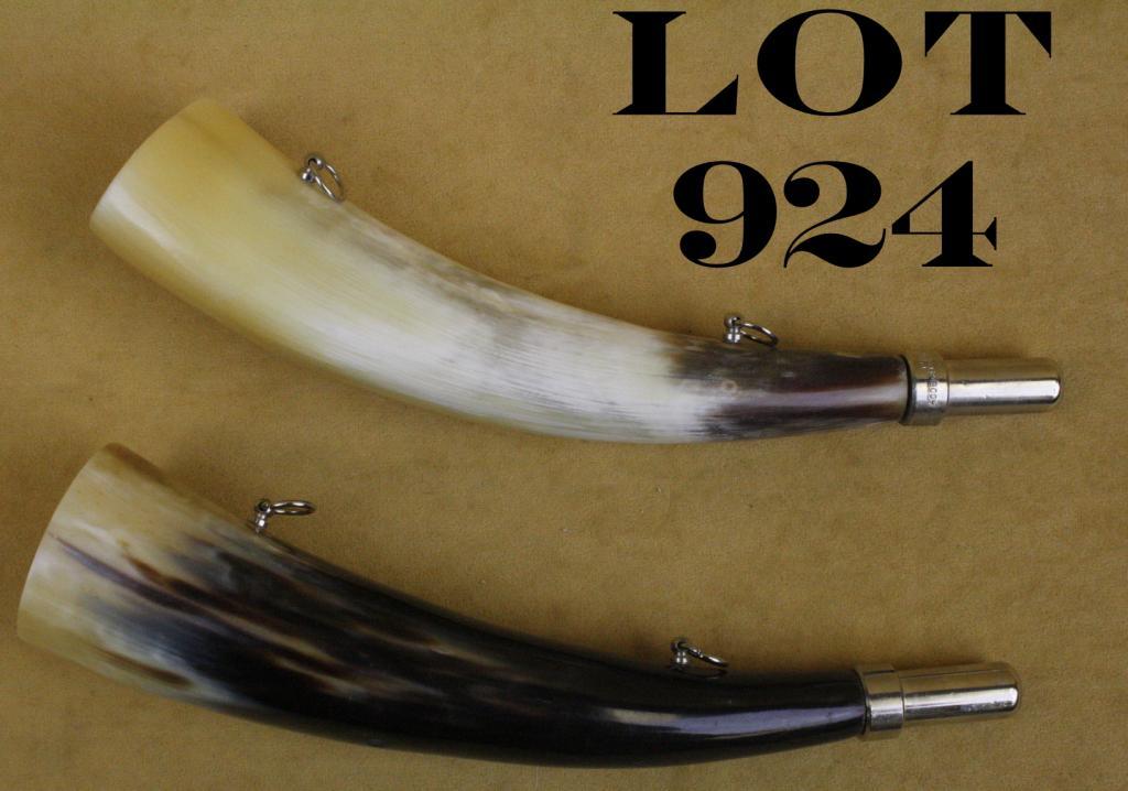 Lot of two calling horns by Elless, each approx. 10” overall with one white and brown, the other white and black, each with two hanging rings and both in overall very good condition. Est.: $100-$200.