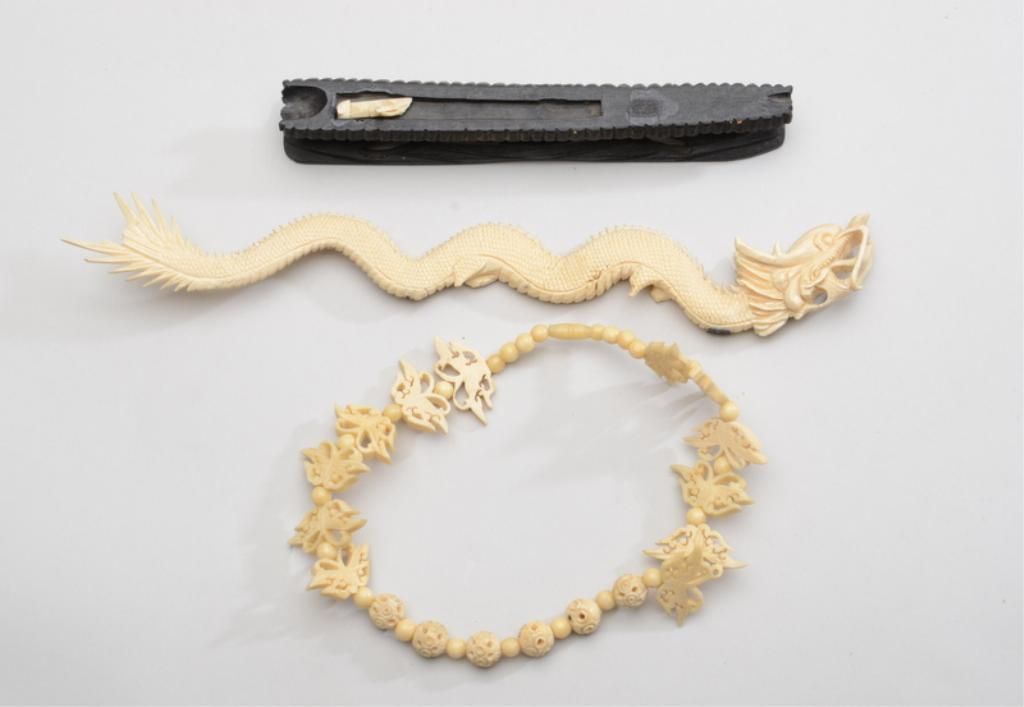 Lot of two carved ivory pieces including a finely accomplished mythical oriental dragon approx. 10” overall with some slight damage and a carved necklace with butterflies and carved balls in overall good condition.Est.: $150-$300.