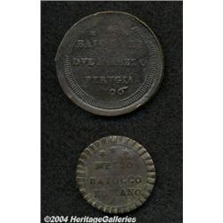 <B>Lot of two coins as follows:</B></I> KM1243, 1/2 Baiocco ND (year 23), Fine; Perugia KM3 2-1/2 Baiocchi, 1796, Very Fine, much corrosion. 2 coins <BR><BR><B>Important notice:</B> Heritage usually auctions material at the rate of 200-250 lots per hour. On some occasions eBay Live bid software or the Internet may not be able to keep up with the pace of the auction. We recommend placing a realistic absentee bid now as insurance to avoid disappointment. Occasionally the auctioneer may eliminate or reject an eBay Live bid, and the auctioneer may also reopen a lot after the close of the eBay live bidding (usually because we missed an audience bid), and may reject your bid even if it shows you as the winning bidder. By bidding via eBay Live, you agree that Heritage may award the lot to another bidder at its sole discretion under the circumstances described above or any other reasonable circumstances. Since eBay bids are not shown to us until we open the lot on the floor, we treat those bids just like floor bids. In most cases the floor responds before the eBay bid is presented to us, due to Internet lag time, so for consistency we have made it a policy that floor bids are always considered first over tie eBay live bids. Also please note that all Heritage lots purchased through eBay Live carry a 20% Buyer's Premium. Please make sure you read the Terms and Conditions before you bid.