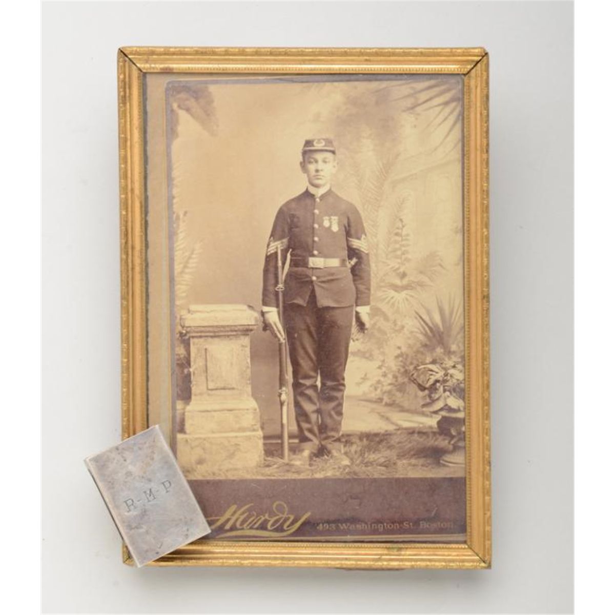 Lot of two collectibles including a framed Cabinet photo of a U. S. soldier in dress uniform with percussion rifle by Hardy of Boston, MA and penciled on the back “Edwin Willis Pierce”; also a metal matchbox caseinscribed “R-M-P”. Est.: $150-$300.