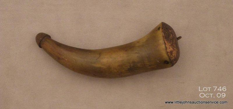 Lot of two collectibles including a large brass  Ames Peace flask, approx. 9” overall marked “N.P.  Ames” and dated “1837” on the base of the spout,  in overall fair + condition showing an old  soldered repair to affix the spout to the body ofthe flask (that displays a heavy dark patina);  also a small priming horn, approx. 7” overall with  wood rounded bottom plug in overall good  condition and showing considerable age.   Est.:   $200-$300.