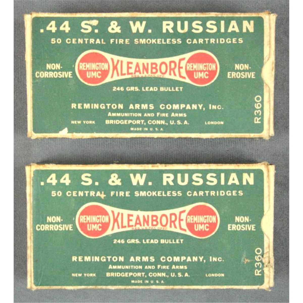 Lot of two collector’s ammo boxes of .44 S&W Russian cartridges by Remington, UMC in the “dogbone” Kleanbore green, red and white box both boxes in good condition, one is full and the other is partial only. Est.: $50-$100.