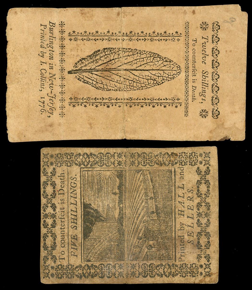 Lot of two colonial notes: New Jersey, 12 shillings, March 25, 1776, serial 3867, and Pennsylvania,