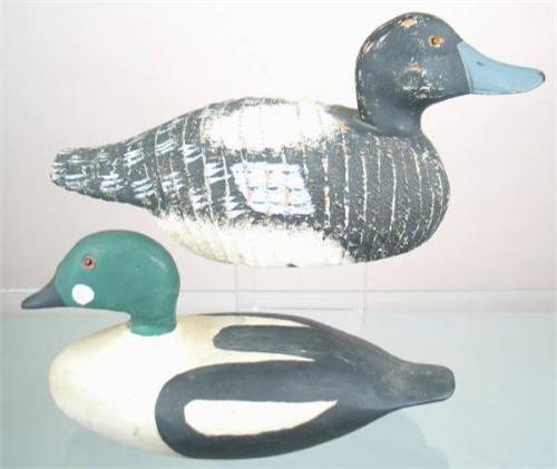 Lot of two decoys. Factory made, turned body, bluebill drake with glass eyes. In XOP, unused. Few surface rubs and dents. A golden eye drake by Willard Cean, Brownville, NY ca 1940 in XOP. Narrow back check with some flaking and a tight neck check (decoy)