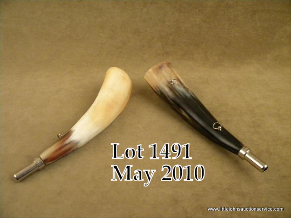 Lot of two display contemporary cow horn calling horns, each approx. 10” overall with nickeled mouthpieces and two hanging loops, marked “Elless, Model E”. Est.: $50-$100.