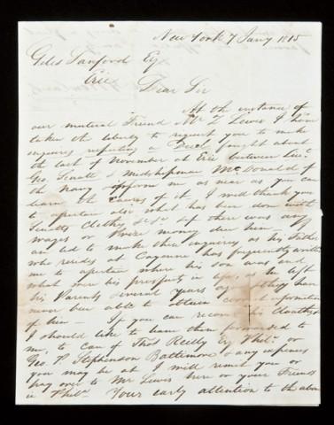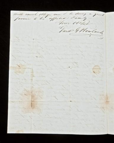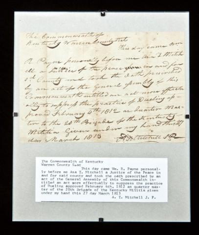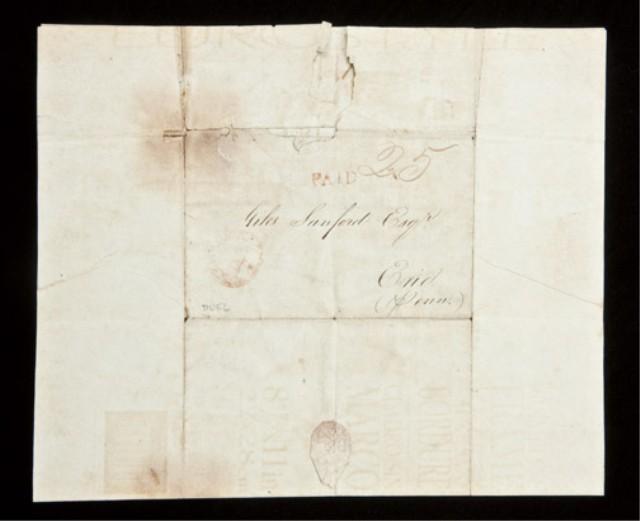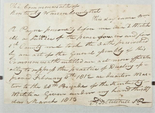 Lot of two documents regarding dueling ; 1) Letter approx. 9-3/4” by 7-7/8”, January 1851, from Gardner Howland of New York to Giles Lanford Esq. of Erie, New York. ‘At the insistence of our mutual friend, Mr. Lewis, I have taken to make the inquiries’ regarding a duel fought at Erie and shows seals and postage stamps on reverse. E2) A short letter or note, approx. 5-1/4” by 7-1/2”, the commonwealth of Kentucky, Warren County Seat, concerns Wm. R. Payne mentions Mitchell, Justice of the Peace, took an oath to effectively suppress the practice of dueling, effective February 1812, as quartermaster in the Kentucky Militia, signed the 27th day of March, 1813. Signed A. T. Mitchell, Justice of the Peace. The condition is good with some folding, slight burning, normal aging. At least very good, clearly written and very legible. From the William R. Orbelo Collection. Est: $350 - $700