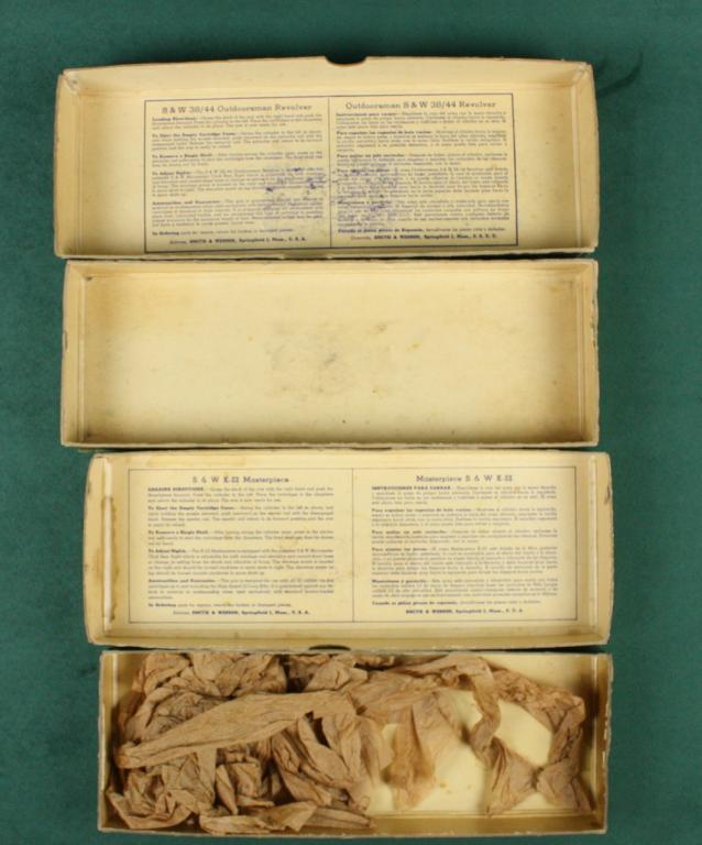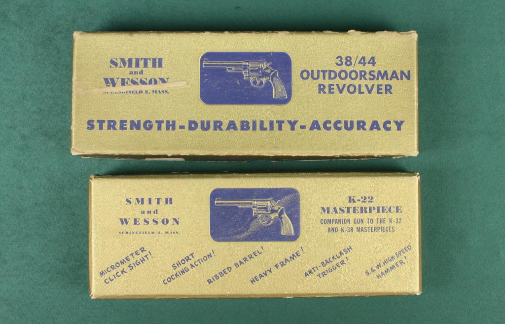 Lot of two early Smith and Wesson gold and  blue two piece factory boxes, both in overall  very good condition; one for a 38/44  Outdoorsman, blue finish, 6-1/2” barrel  revolver; the other for a K-22 Masterpiece,blue finish, 6” barrel; if you have the guns,  you need the boxes!  Est.:  $50-$100.
