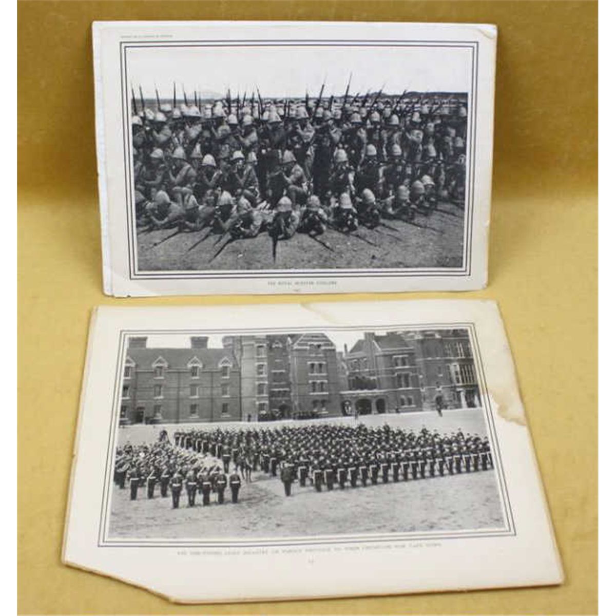 Lot of two early book pictures of British soldiers, circa the Boer War, image sizes approx. 8” x 12”; one is entitled “The Royal Munster Fusiliers” showing soldiers in a tightly formed defensive grouping withrifles; the other is entitled “The Shropshire Light Infantry on Parade Previous to their Departure for Cape Town” showing a long range shot of the members of this unit in their dress uniforms in front of a group of brickbuildings; both pictures are overall good with the later showing a lost lower left corner of page that does not affect the picture. Would frame up nicely for the military collector’s room or office. Est.:$50-$100.
