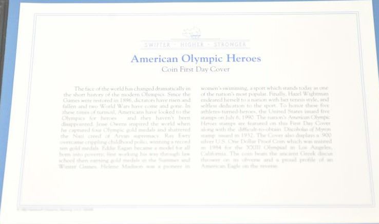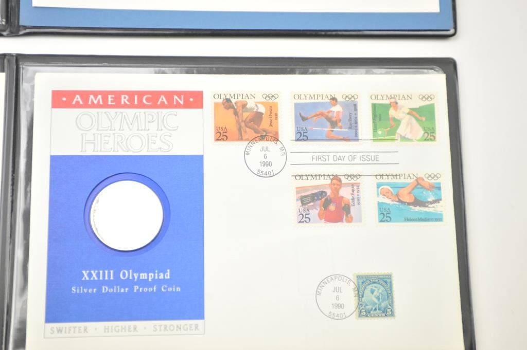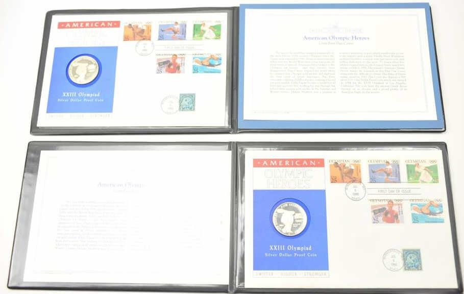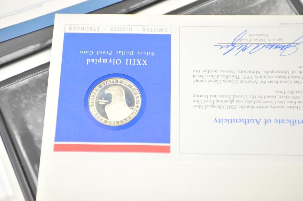 Lot of two first day cover stamps with Silver Dollar proof coins commemorating the XXIII Olympiad in Los Angeles. The covers indicate issue on July 6, 1990 in Minneapolis, Minnesota. The covers are in portfolios with certificates of authenticity. Est.: $50-$100.