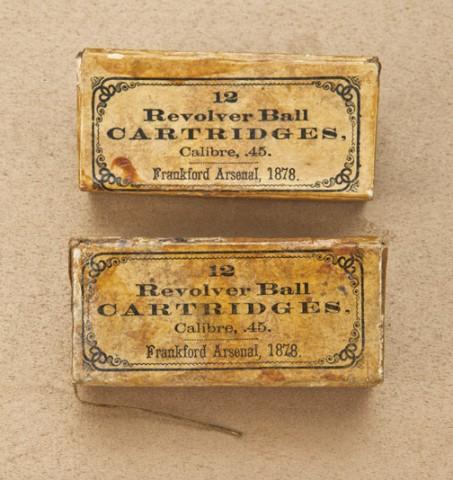 Lot of two full boxes of .45 caliber cartridges, Frankford arsenal 1878. Both unopened and full showing some staining, tatters, small losses. Est: $400 - $800