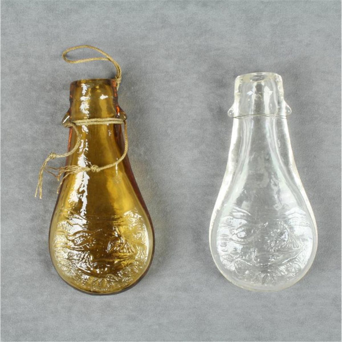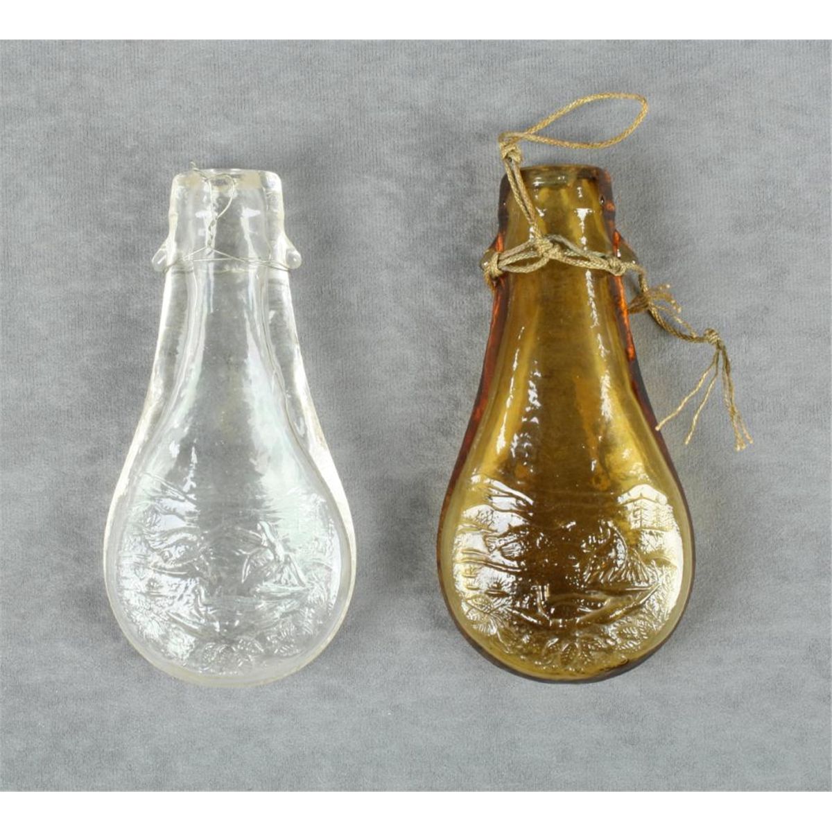 Lot of two hand-blown glass powder flasks, one clear the other in a brown tone, both with game scenes, no spouts and both in very good condition. Est.: $100-$200.