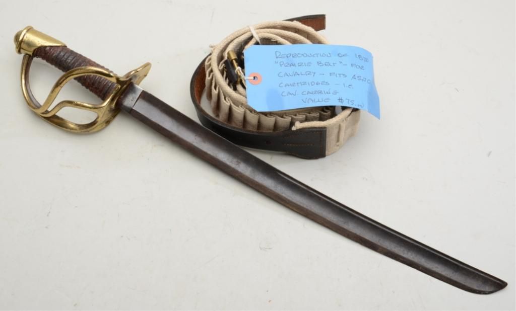 Lot of two items including an cutdown authentic N.P. Ames cavalry sword to an approx. 18” blade in overall fair condition and a quality modern copy of an Indian Wars era prairie cartridge belt in fine condition. Est.: $100-$150.