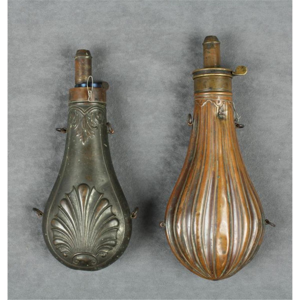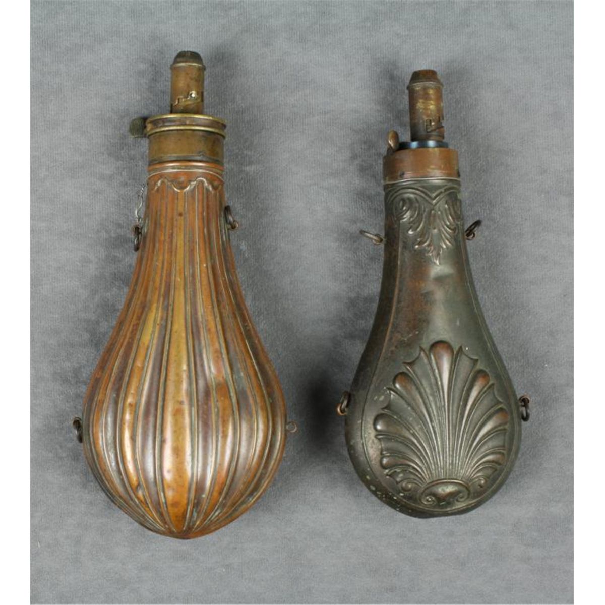 Lot of two large brass shotgun flasks, one marked Am. Flask & Cap Co., both approx. 9” overall and both in uncleaned good condition. Est.: $75-$150.