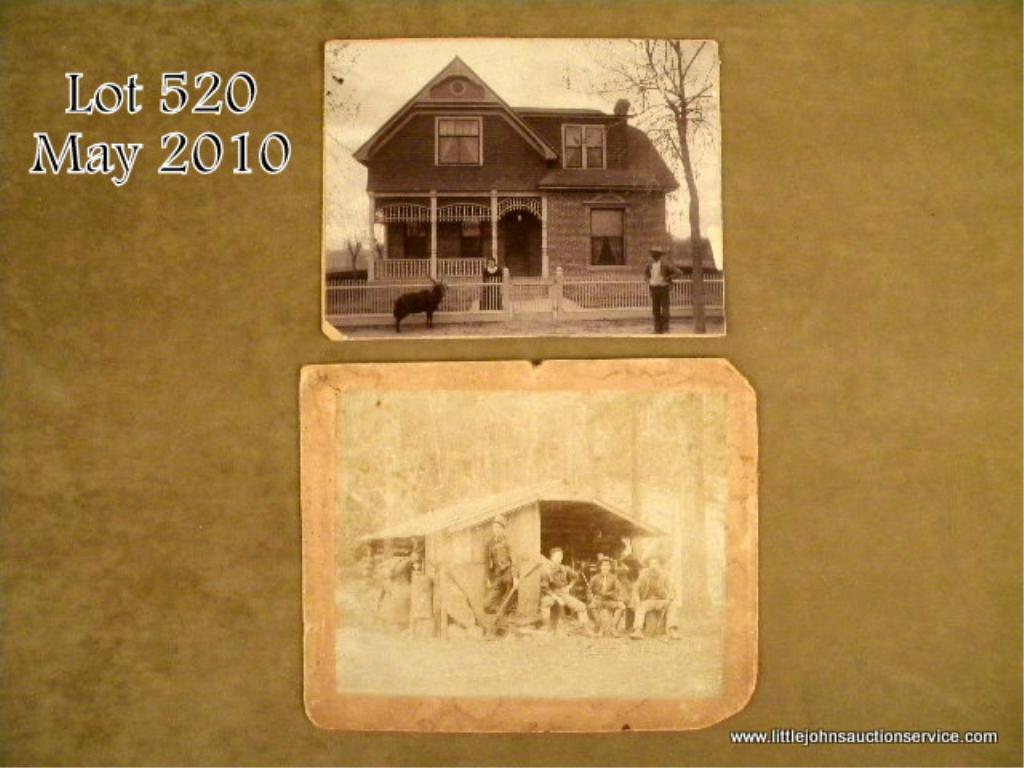 Lot of two large original cabinet photos, the first being an important image showing four men, three with Marlin rifles, in front of a shelter with sign above the entrance “Oleary & Lawler”, approx. 6” x 8” and also labeled in the photo “The first cabin in Skaguay (Alaska). This image is in overall good condition with some slight fading but otherwise very focused and complete; it appears each of the individuals in the photo have been id’ed on the lower portion of the photobackboard from left to right with the first three difficult to make out but the far right man is noted as “Matheson”. Skaguay was a rough and tumble Alaskan mining and gambling town where the likes of Soapy Smith and other notables operatedin the late 1800s.; the second original photo is also approx. 6” x 8” and in very good condition showing a two story brick and shingle house with picket fence and decorative fretwork; also standing in front is an African American man, awhite woman and a ram with unusual rack of horns standing by the fence. Est.: $100-$150.
