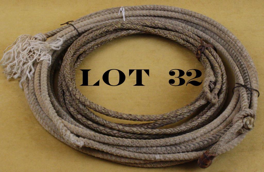 Lot of two lariats including an older woven rawhide piece and a later style synthetic length both with loop ends; great for the horse person or decoration for the tack room. Est.: $50-$75.