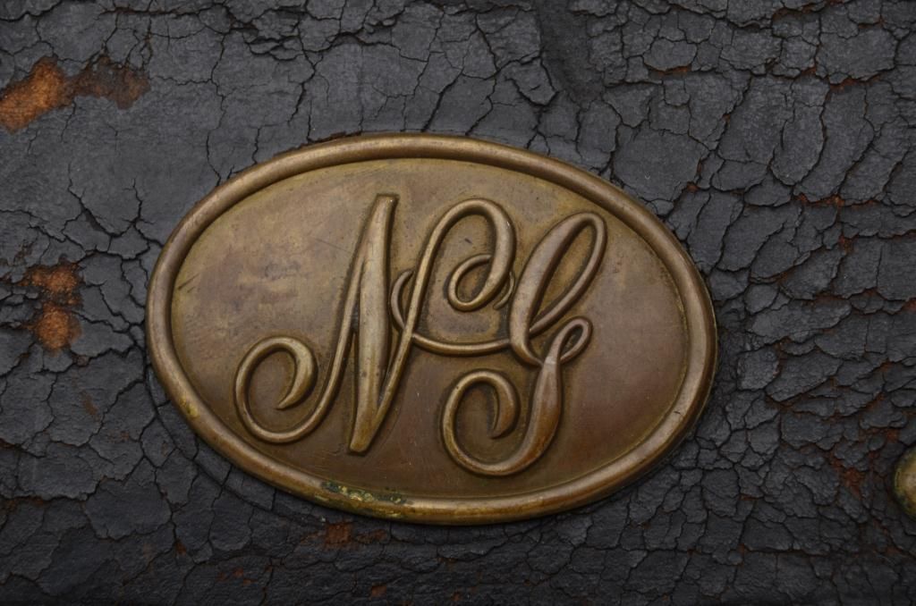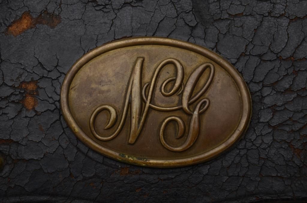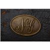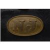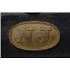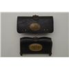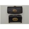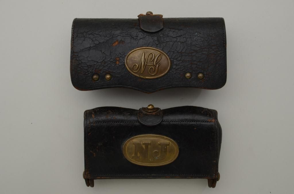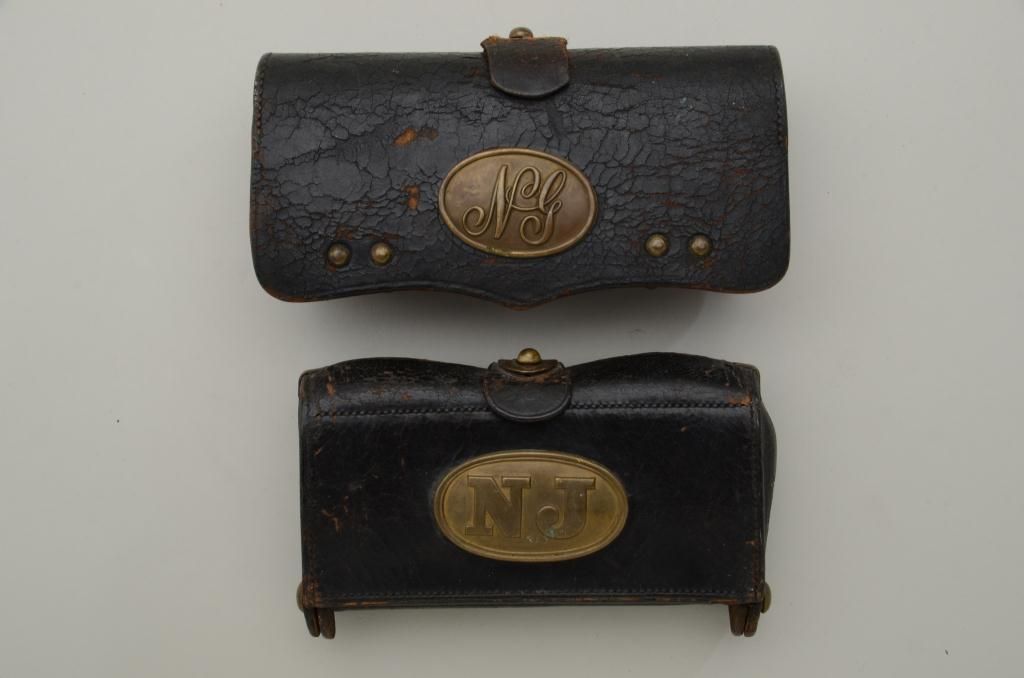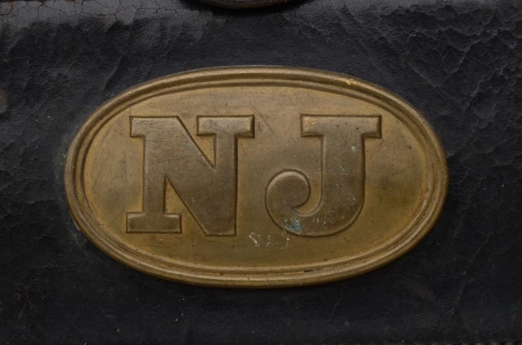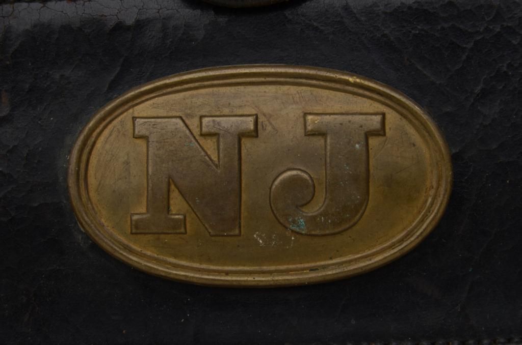 Lot of two leather military cartridge boxes each in fair + condition with brass plate on front of cover flap, each “NJ” (New Jersey) in two different styles. Est.: $150-$300.