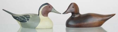 Lot of two miniature decoy models from The Red Farm Studios, Providence, RI. A pintail drake painted by M. Stannert and signed on the bottom and a carving in stained wood. XC. Sanborn collection. (decoy)