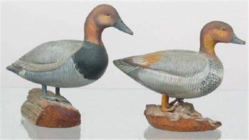 Lot of two miniature ducks by J. Ahearn. A Canvasback drake and a gadwall drake. Both are signed on the bottom of the base and the gadwall has $15.00 written in pencil. Both have neck checks that have been reglued. (decoy)